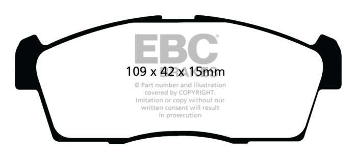 Nie pozwól, aby niższa cena zamiennika przesłoniła Ci ten doskonałej jakości produkt, który zatrzyma Twój samochód równie sprawnie, jak klocki oryginalne, a przy tym szybciej niż większość innych dostępnych na rynku. Wspaniałą zaletą klocków EBC jest ich zdolność do całkowitej eliminacji szarpania przy hamowaniu – po 450-600 km przebiegu praktycznie KOMPENSUJĄ szarpnięcia o umiarkowanym natężeniu. Nominalny współczynnik tarcia 0,46, przy minimalnym ścieraniu tarcz hamulcowych oraz pyleniu na poziomie części oryginalnych.