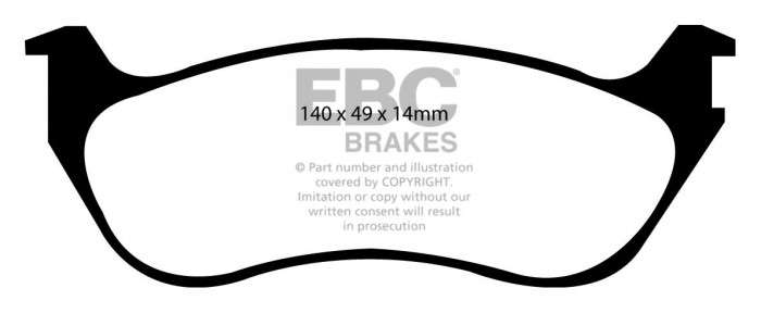 Nie pozwól, aby niższa cena zamiennika przesłoniła Ci ten doskonałej jakości produkt, który zatrzyma Twój samochód równie sprawnie, jak klocki oryginalne, a przy tym szybciej niż większość innych dostępnych na rynku. Wspaniałą zaletą klocków EBC jest ich zdolność do całkowitej eliminacji szarpania przy hamowaniu – po 450-600 km przebiegu praktycznie KOMPENSUJĄ szarpnięcia o umiarkowanym natężeniu. Nominalny współczynnik tarcia 0,46, przy minimalnym ścieraniu tarcz hamulcowych oraz pyleniu na poziomie części oryginalnych.